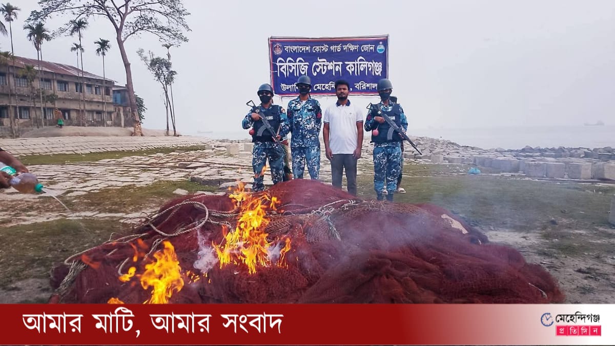 মেহেন্দিগঞ্জে ঝাটকা ধরার দায়ে ৩টি রাক্ষুসে বেহুন্দি জাল জব্দ, মাছ নদীতে অবমুক্ত